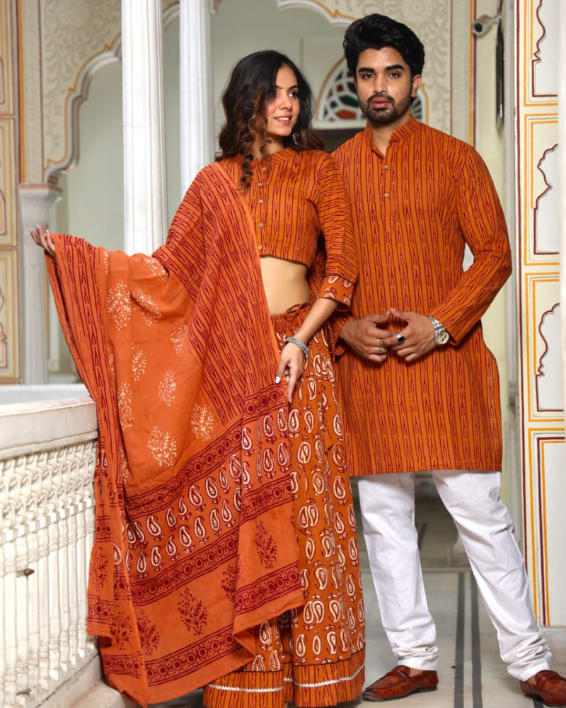- Bagru Hand Block Printed Designer Top & Skirt With Mulmul Dupatta.