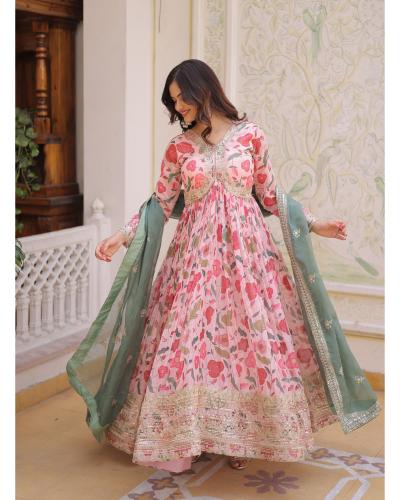 👉🏻 *FABRIC & WORK *:- Digital Printed Russian silk With Embroidery Zari Sequins-work