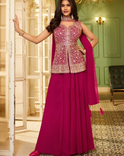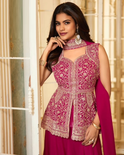 - Thread with sequence work,on viscose fabric, designer front cut peplum with plazoo & Neck Dupatta