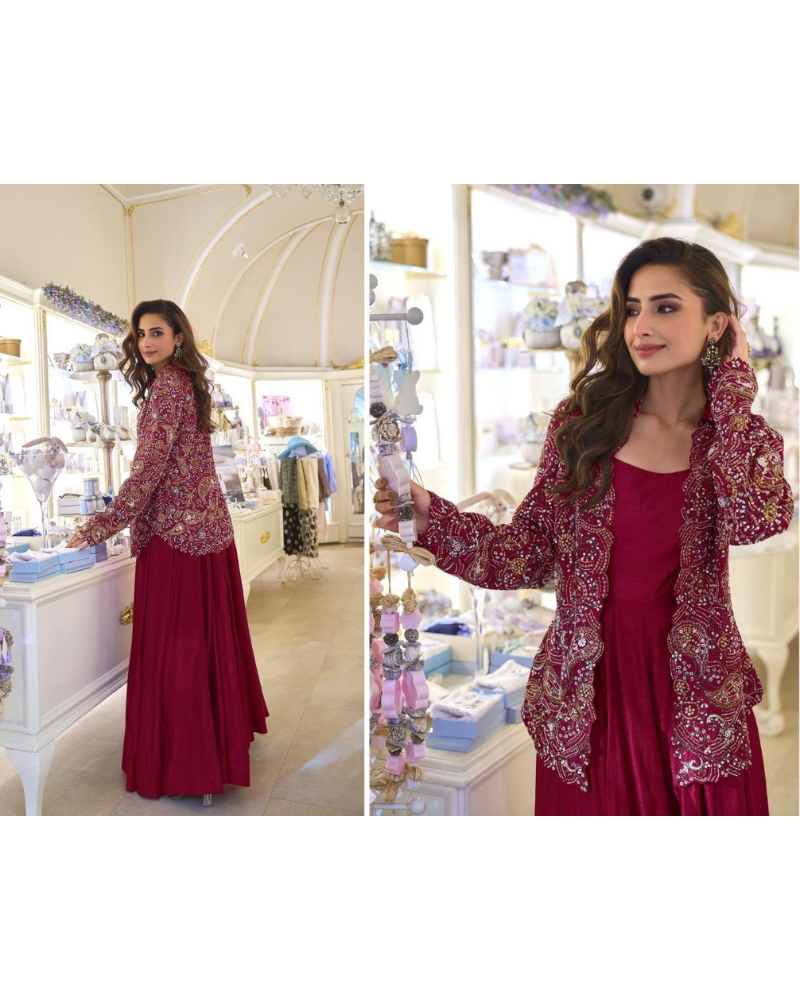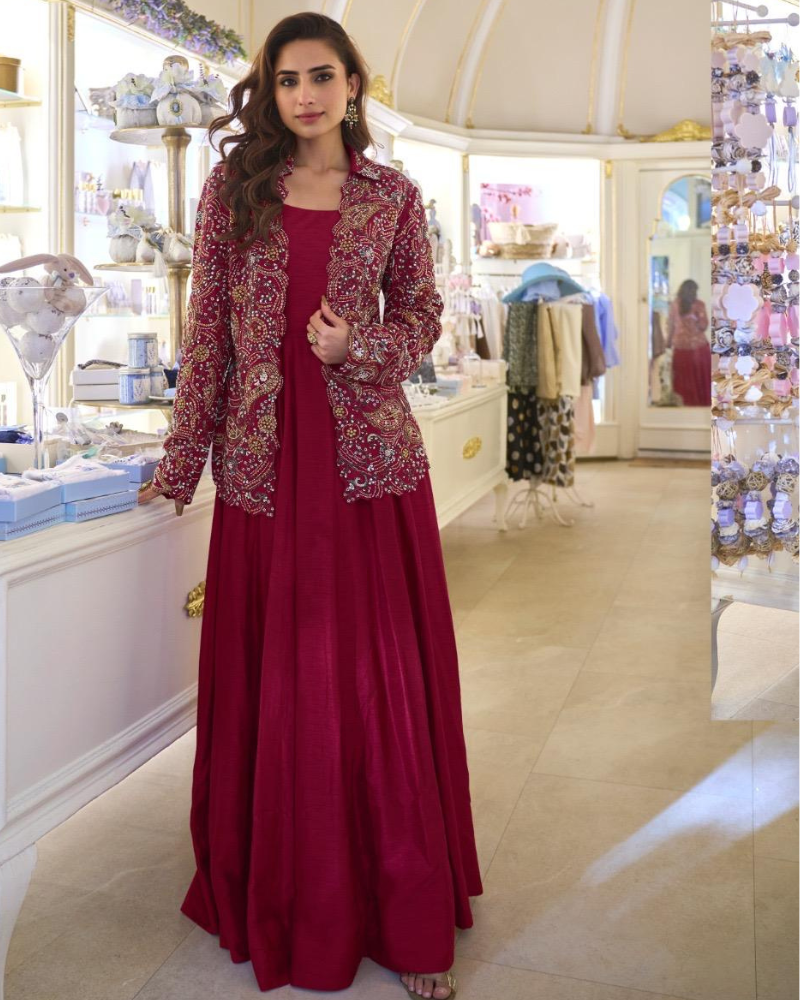 - FABRIC – PREMIUM REAL SILK ( STYLIST WEDDING FULL HEAVY LOOK BEADS EMBROIDERED FRONT AND BACK WORK JACKET WITH SILK GOWN )