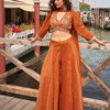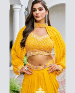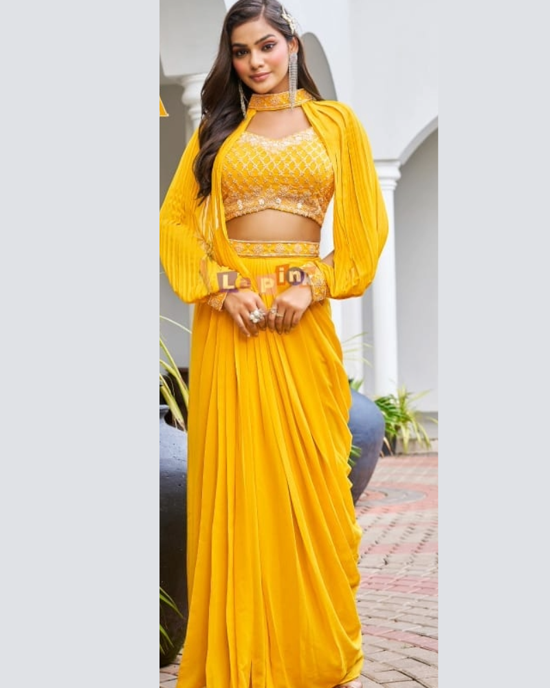 - Multi Moti with sequence work,on viscose fabric, designer Drape skirt with top & Neck sleeves.